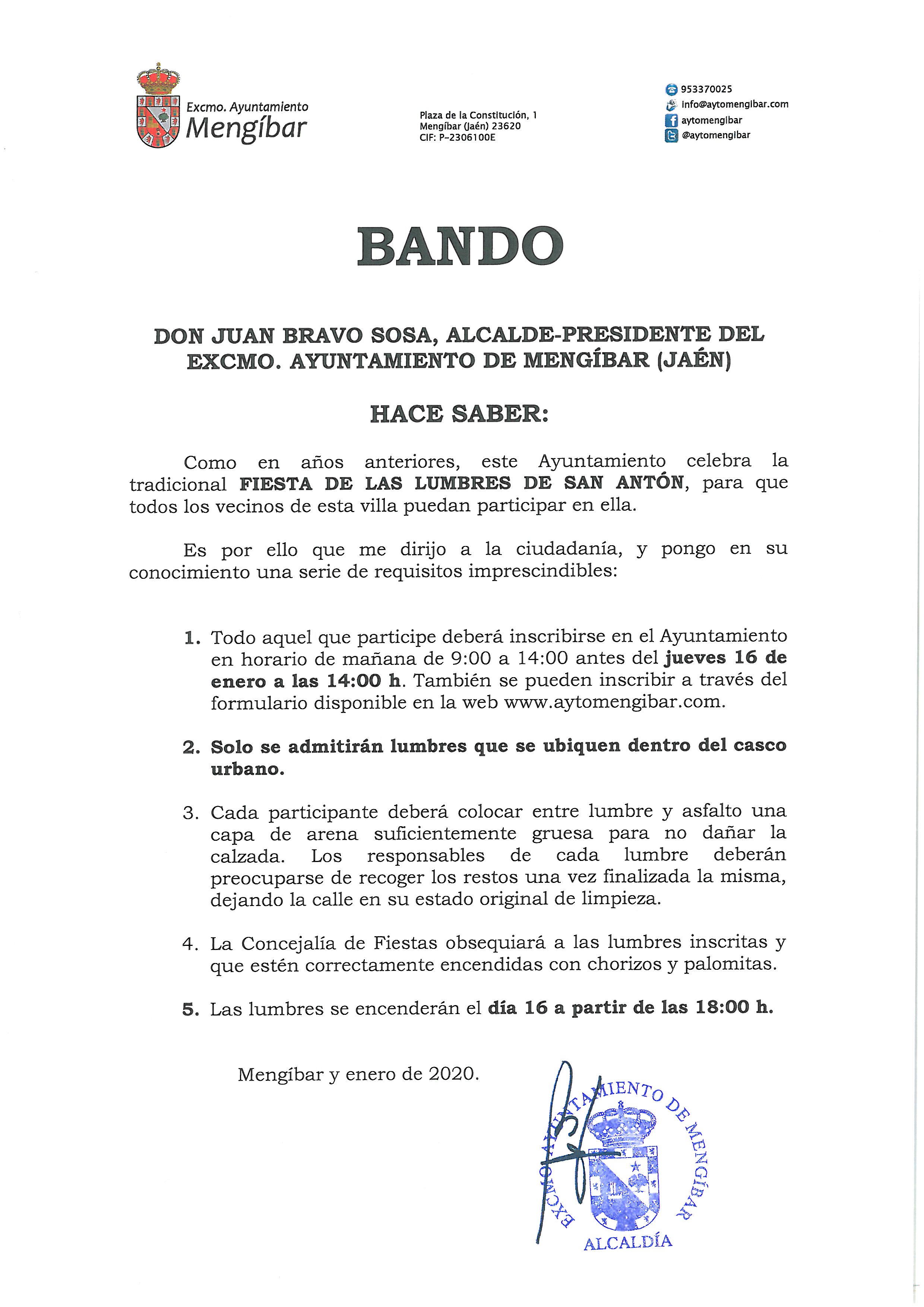 Para las lumbres, han de inscribirse preferiblemente a través del siguiente FORMULARIO WEB (ENLACE DIRECTO), desde el 10 al 16 de enero (hasta las 14:00 horas). También pueden hacerlo presencialmente en el Ayuntamiento de Mengíbar, en horario de 9:00 a 14:00 horas.